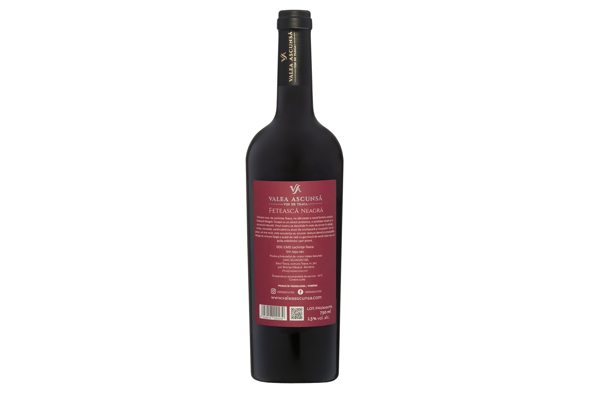 Fetească Neagră, tipică, blândă, caldă şi expresivă, baricată timp de 6 luni în barrique nou din stejar românesc.